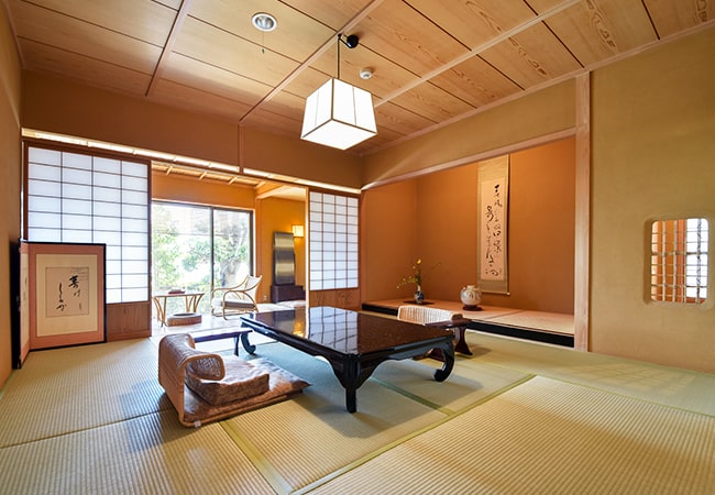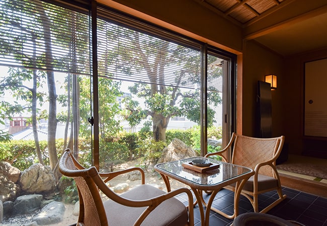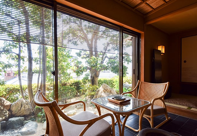 部屋には柔らかな光が差し込み、広縁からは日本庭園と飛鳥乃湯泉が見える。籐の座椅子や伊予簀、つくばいなど、端正で涼やかな演出に伊予のおもてなしを感じる。