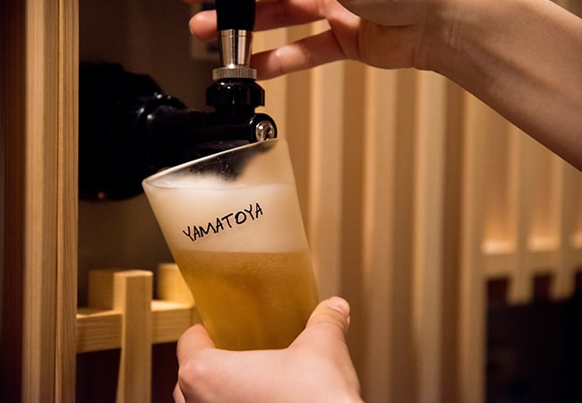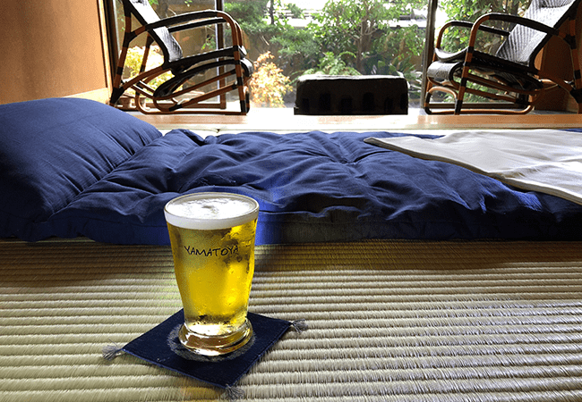 湯上りは砥部焼の冷えたグラスにビールを並々注いで至福の一杯。湯上り処にて、生ビールやミネラルウォーターを無料で