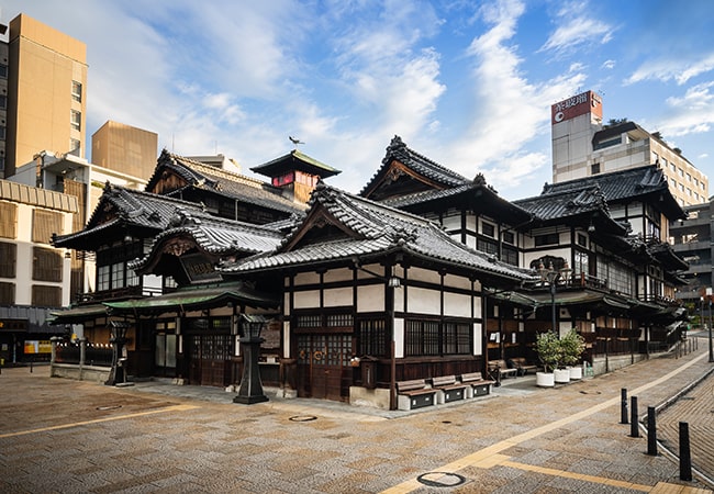 [当館より徒歩約6分]松山空港到着後、空港リムジンバスで道後温泉駅前へ。(所要時間:約40分)