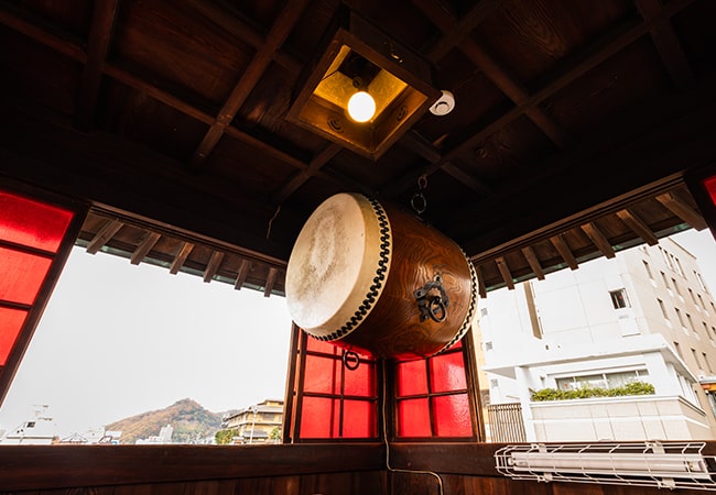 振鷺閣の刻太鼓とともに館内へ。外湯めぐりの際は、石鹸、フェイスタオル付の大和屋別荘