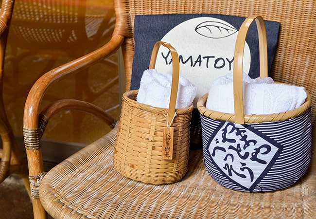 オリジナル湯かご(もしくは布バッグ)セットをお渡しいたします。