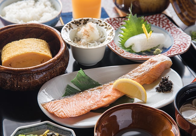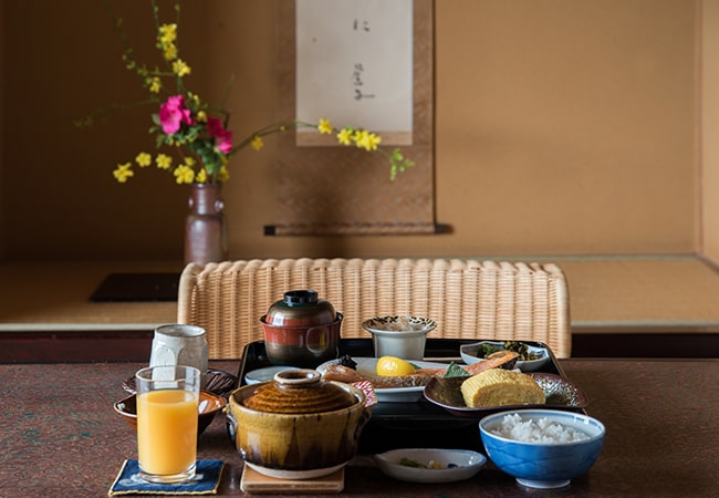 調理長が前日に仕込んだという塩鮭に思わず目を見合わせる。普通の2倍サイズはあるだろうか。芳しい香りにふっくら艶やかな身、私も妻もご飯が進む。穏やかな朝時間につくばいの音が心地よい。